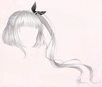 Silver hair worn in a short bob with a thick amount pulled back on each side. A long curling side-tail is worn on the left with a black knotted bow. The bangs are straight-cut while the forelocks frame the face — the right side is slightly longer and partially curled.