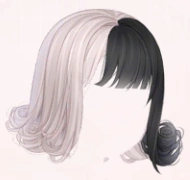 Chin-length two-tone hair that's black on the left side and white on the right. Straight-cut bangs cover the forehead. The longer locks curl upwards at the ends.
