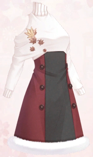 A mid-thigh-length dress. The top of the dress is a white sweater with long sleeves, high collar, and cutouts on the shoulders. On the right-hand side there are orange maple leaves patches. The velvet skirt is red and high-waisted with a wide black panel in the middle. Three brown buttons run down each side of the panel. The hem of the dress is lined with white fur.