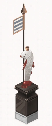A statue of an upright white and red fish with a small gold crown on its head. The fish holds a thin black pole with a pointed gold end and a square, striped blue and white flag. The statue itself is placed on a tall black and grey podium.