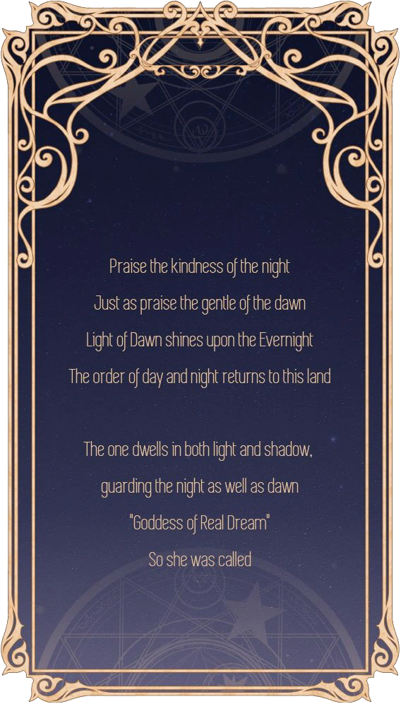 She brought both dawn and night. However, the dawn was always praised, while the night was constantly slandered. She didn't understand why; she was extremely frustrated. So she cursed herself, her real dawn side, and sent her people into the eternal dream and night.