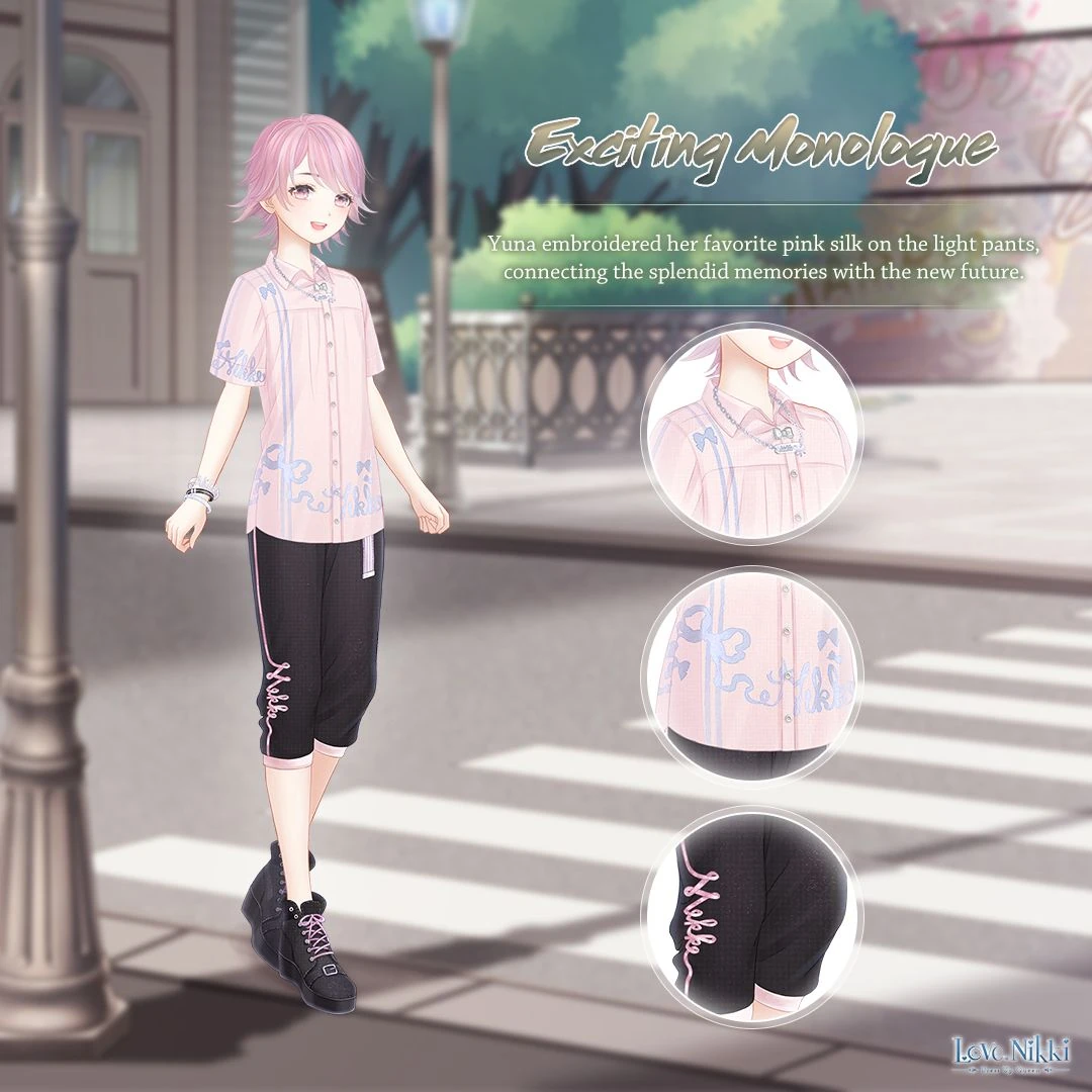Yuna embroidered her favorite pink silk on the light pants, connecting the splendid memories with the new future.