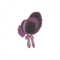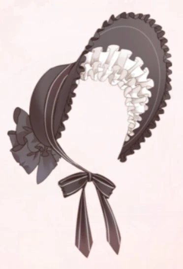 A frilly dark gray bonnet, tied at the chin with bows at the back. There are white ruffles inside.