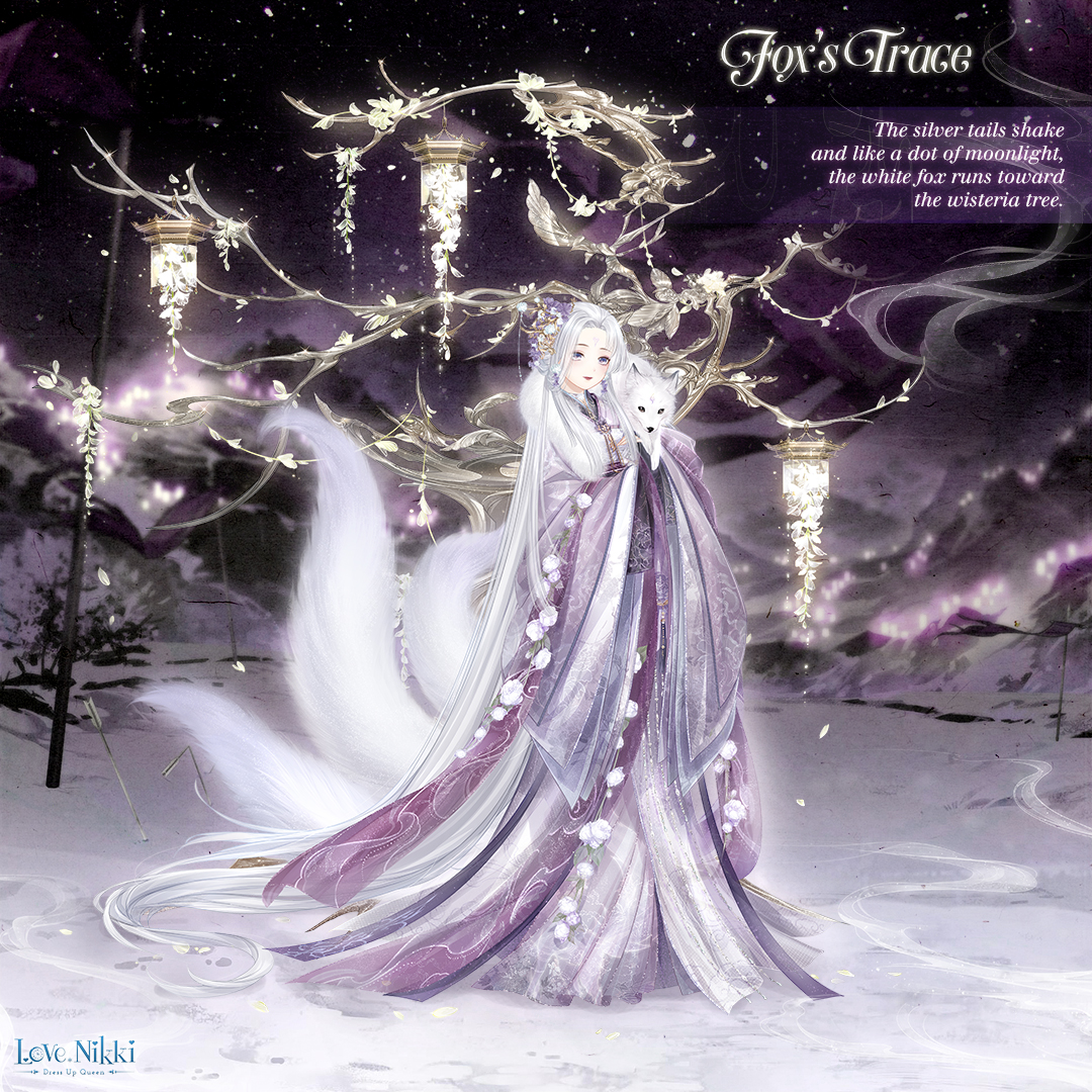 As the title indicates, Fox's Trace is about a white fox who leaves fox footprints on the snow. She shapeshifts as a lady in purple clothes and wears a hairpin decorated with wisteria, which resembles the light fog. She watches over the lantern festival which shines like a dragon at night in Long Street, and as the snow there is lit up by golden lights, nobody notices the fox lady's shadow in the bustle.