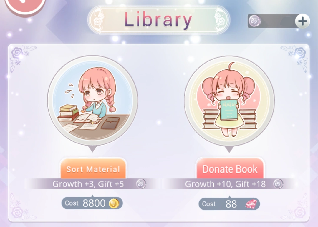 The Library is where the player can earn Growth and Association Coins for the Stylist Association, as well as gain bonuses related to overall gameplay.
