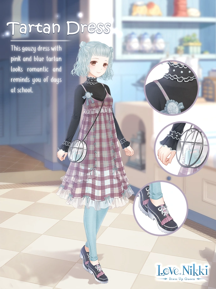 This gauzy dress with pink and blue tartan looks romantic and reminds you of days at school.